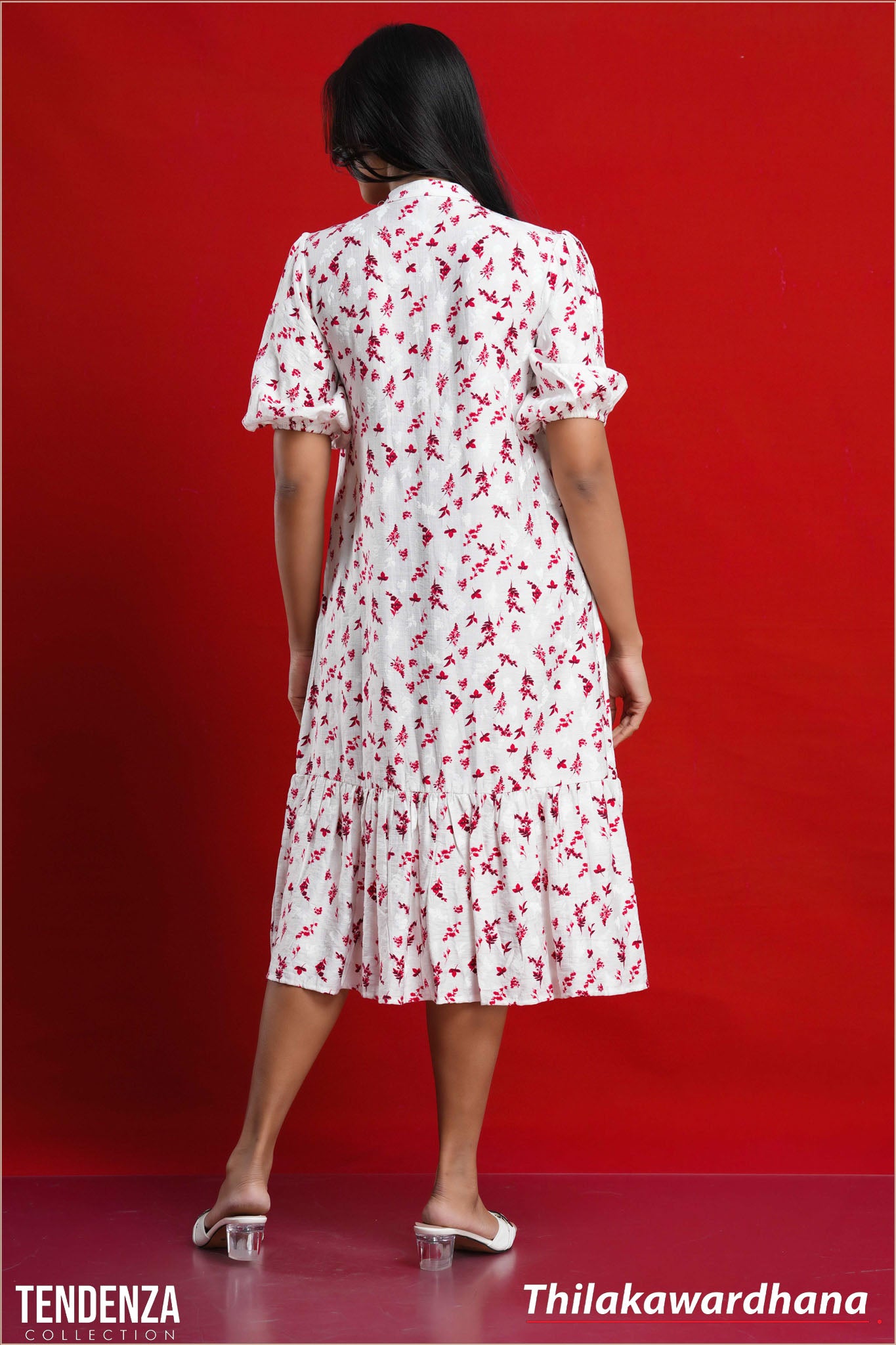 Tendenza Puff Sleeve Frilled Hem Midi Dress
