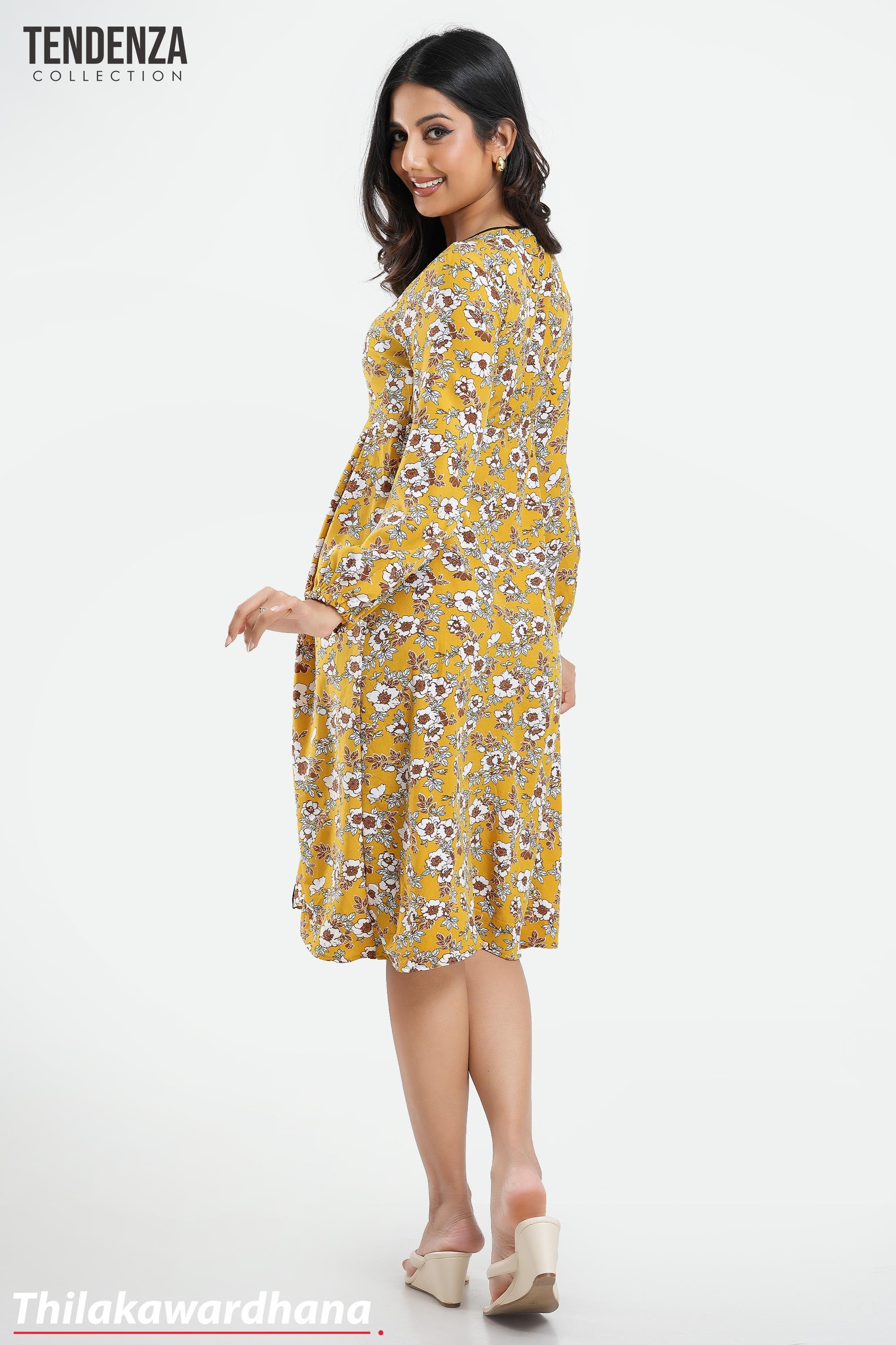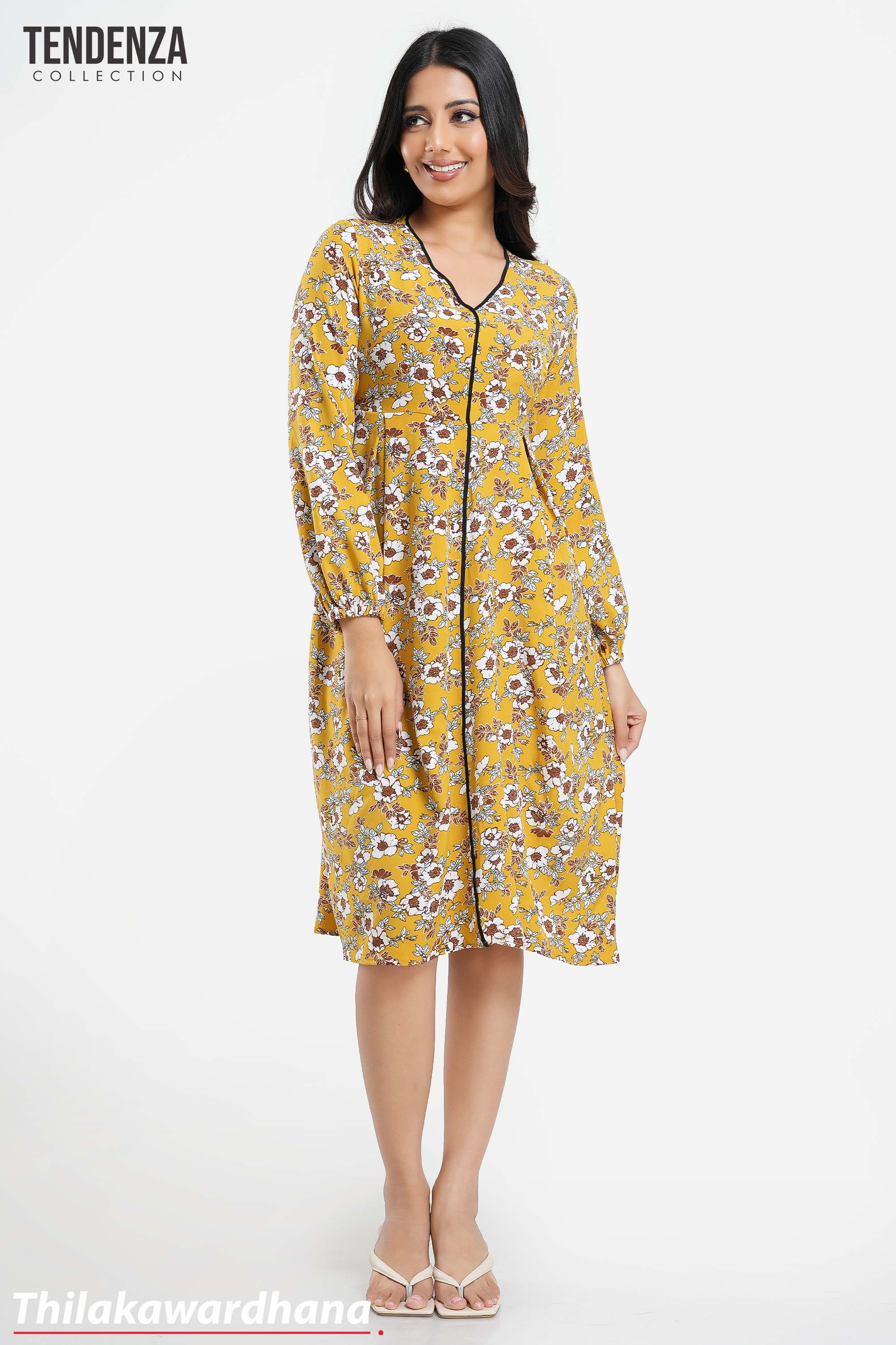 Tendenza Piping Detailed Long Sleeve Printed Dress